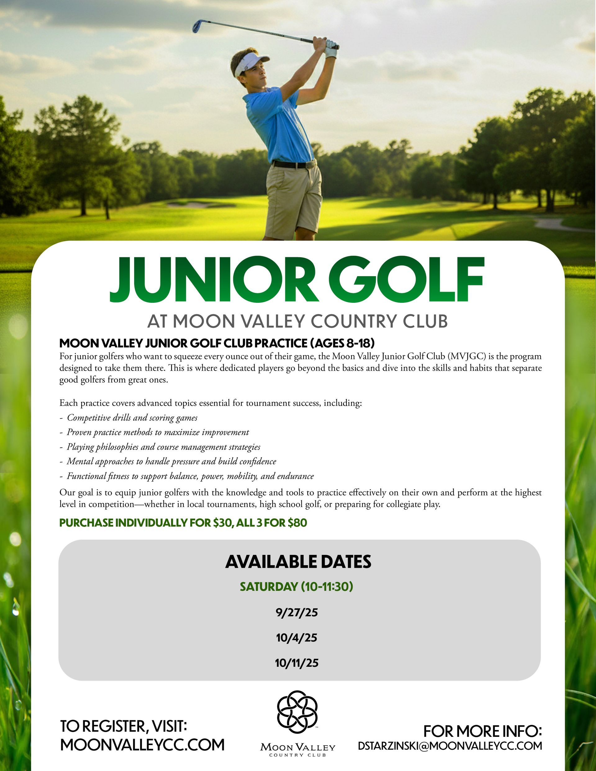 📍 Register through the new Moon Valley CC App — under the Schedule tab, filter for Golf Lessons.